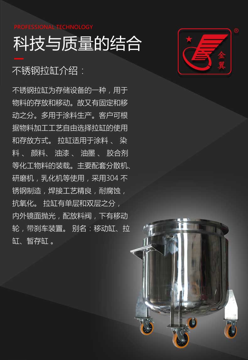 1、 拉缸(分(fèn)散缸)主要由輪(lun)子、金屬缸體、加(jiā)強圈、拉扣等構(gou)成📧,規格和材質(zhi)可定制:水性流(liú)體一般選用不(bu)鏽鋼拉🤟缸,規格(gé)大💛小從100L-5000L不等;